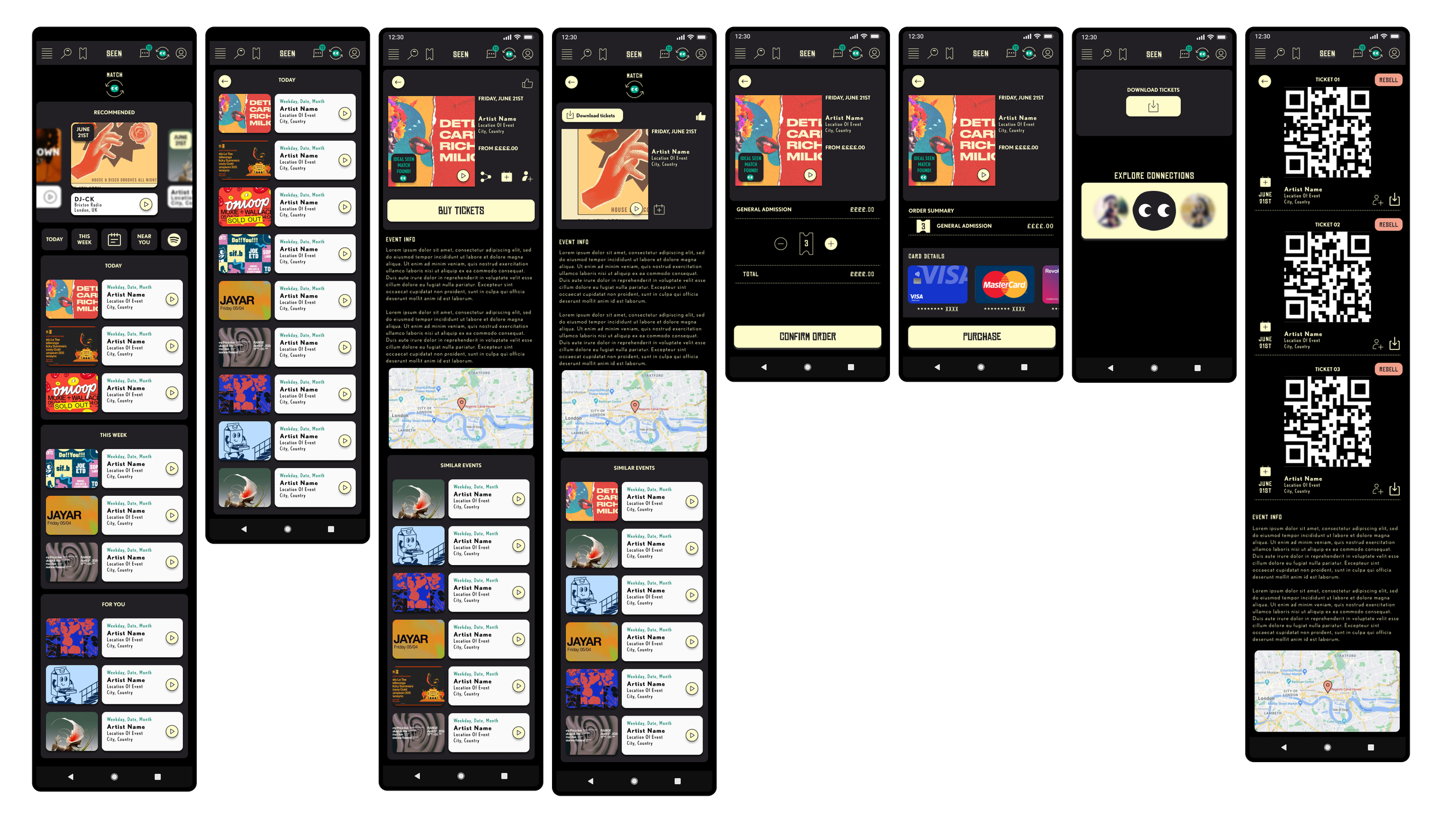 The app's logo features a green circle face with two eye emojis, symbolising the fun and social nature of nights out. The colour palette is predominantly muted and black, which helps the vibrant event posters stand out, ensuring the app maintains a clean and modern look. Accents of yellow are strategically used for buttons and action points, adding a touch of brightness and guiding user interactions. The typographic choices blend modern grunge with a clean sans-serif font, balancing edgy aesthetics with readability. This combination of visual elements underscores SEEN’s commitment to enhancing real-life social connections through technology.