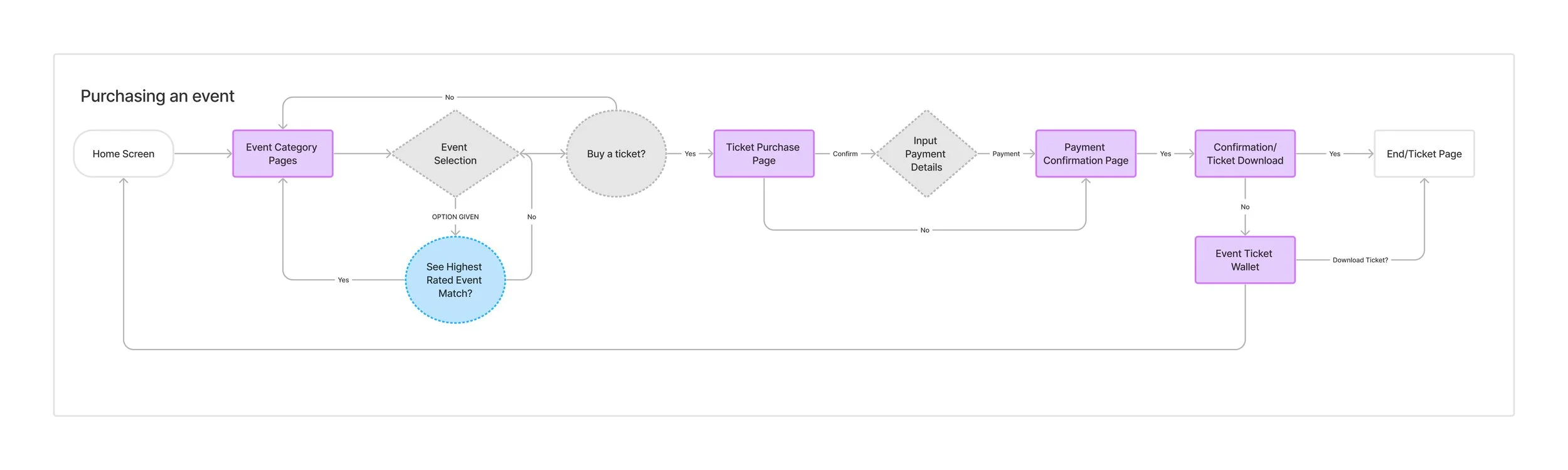 2. Purchasing a Ticket: The flow is aimed to optimise the users end goal by providing promts on whether the user would like to find an event based on highest rated potential matches or on personal music preferences. This filtered platform reduces overstimulation of inforation.